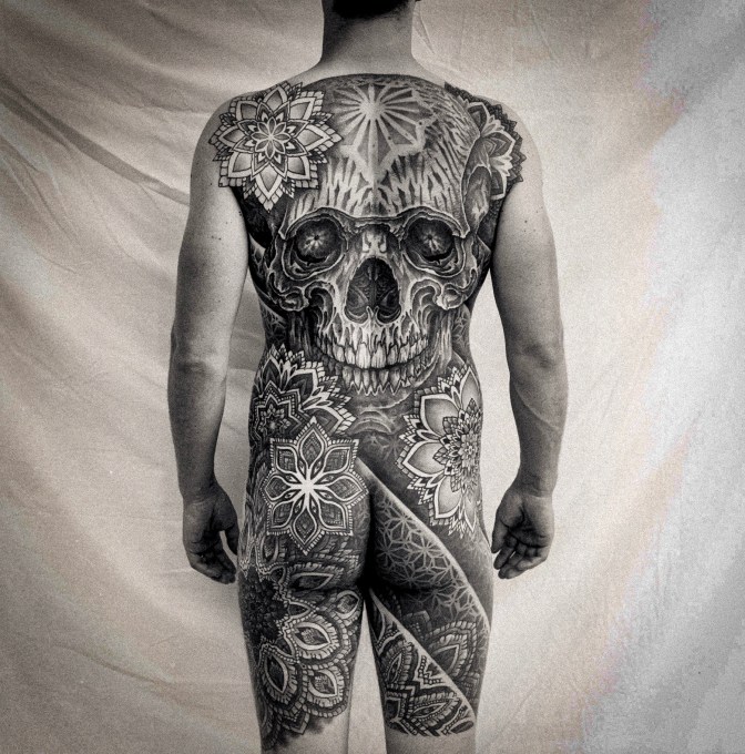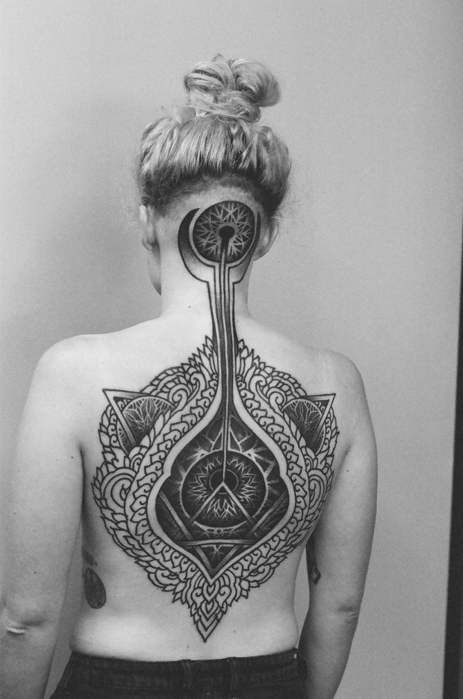 Today my work draws its influences from many things, the sanctum of nature and natural forms, the unconscious, mathematical and geometric patterns, cosmology, and eastern religious images. I try to incorporate these ideas into intricate patterns and symbolism using complex pointillism, repetition, and detailed line-work with the hopes of creating a visual language that is both meditative and pure in form. It is my belief that a tattooist should always be striving to improve his or her skill and to be conscious of how their tattoos may relate and ultimately contribute to the surrounding world of tattooing. I am constantly exploring new ways to improve the skills and options available to me, finding new ways to develop techniques and tools beyond what is already necessary. Given that the skin is my primary material, the path forward for my craft to expand and improve is to find new ways to illustrate and decorate the people I am fortunate enough to tattoo.