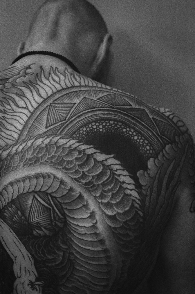 ‘I am a tattooer, an artist, a husband, and a father. My sensibilities as an artist are defined by how I may incorporate and blend these identities into my tattooing’.