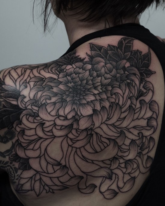 Below is the document of the dedication she has, we finished her right sleeve, started and finished her left armpit and started her back with a giant chrysanthemum. Thank you!