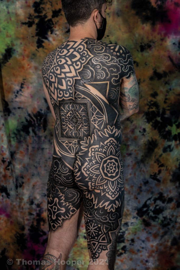 During the last year I have been working on quite a few projects that I decided to not share any pictures of, until they where finished. Ryan has been an amazing client, he first approached me 10 months ago with the idea of getting a large bold solid black work piece inspired by nepalese art and weaving / tapestries.