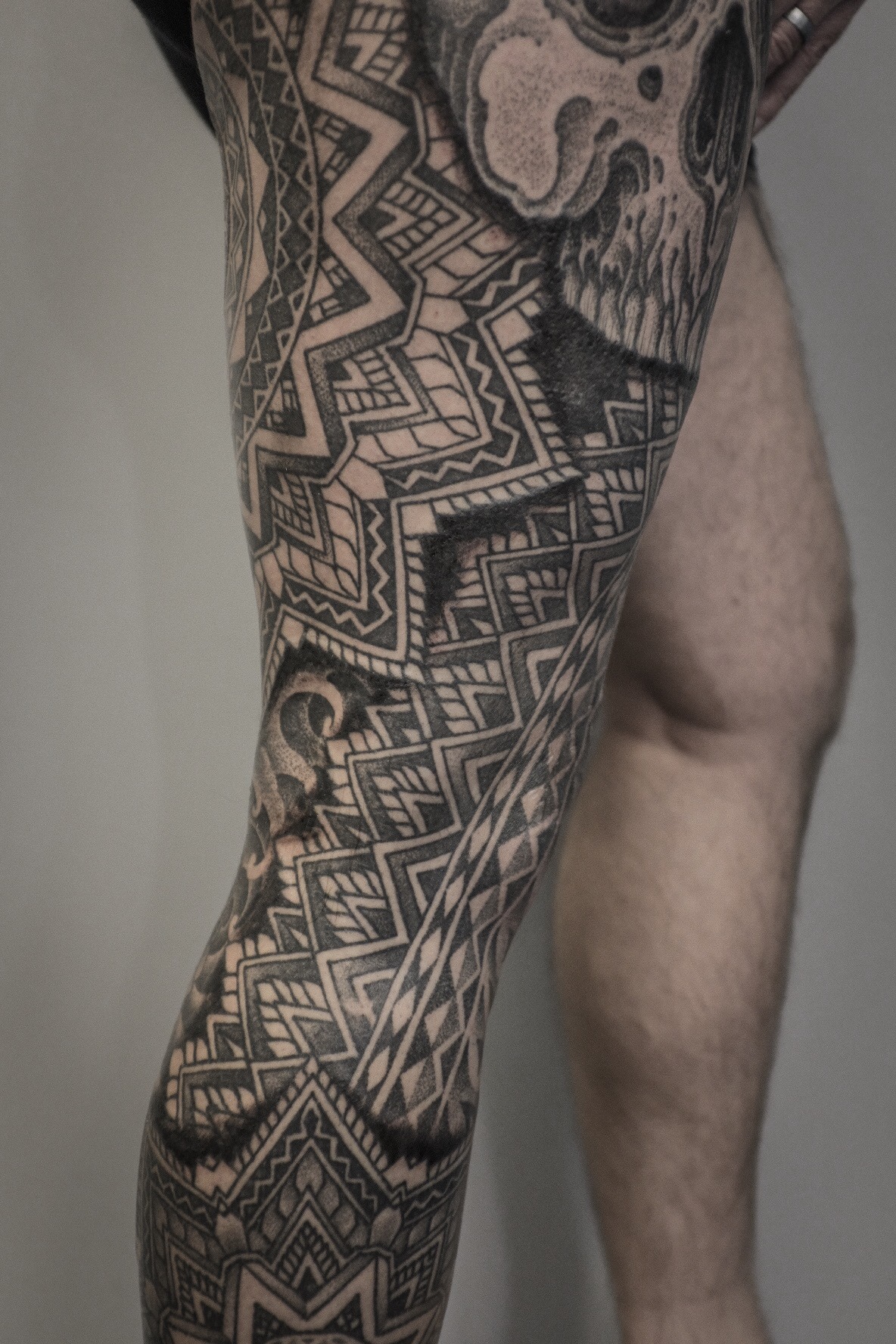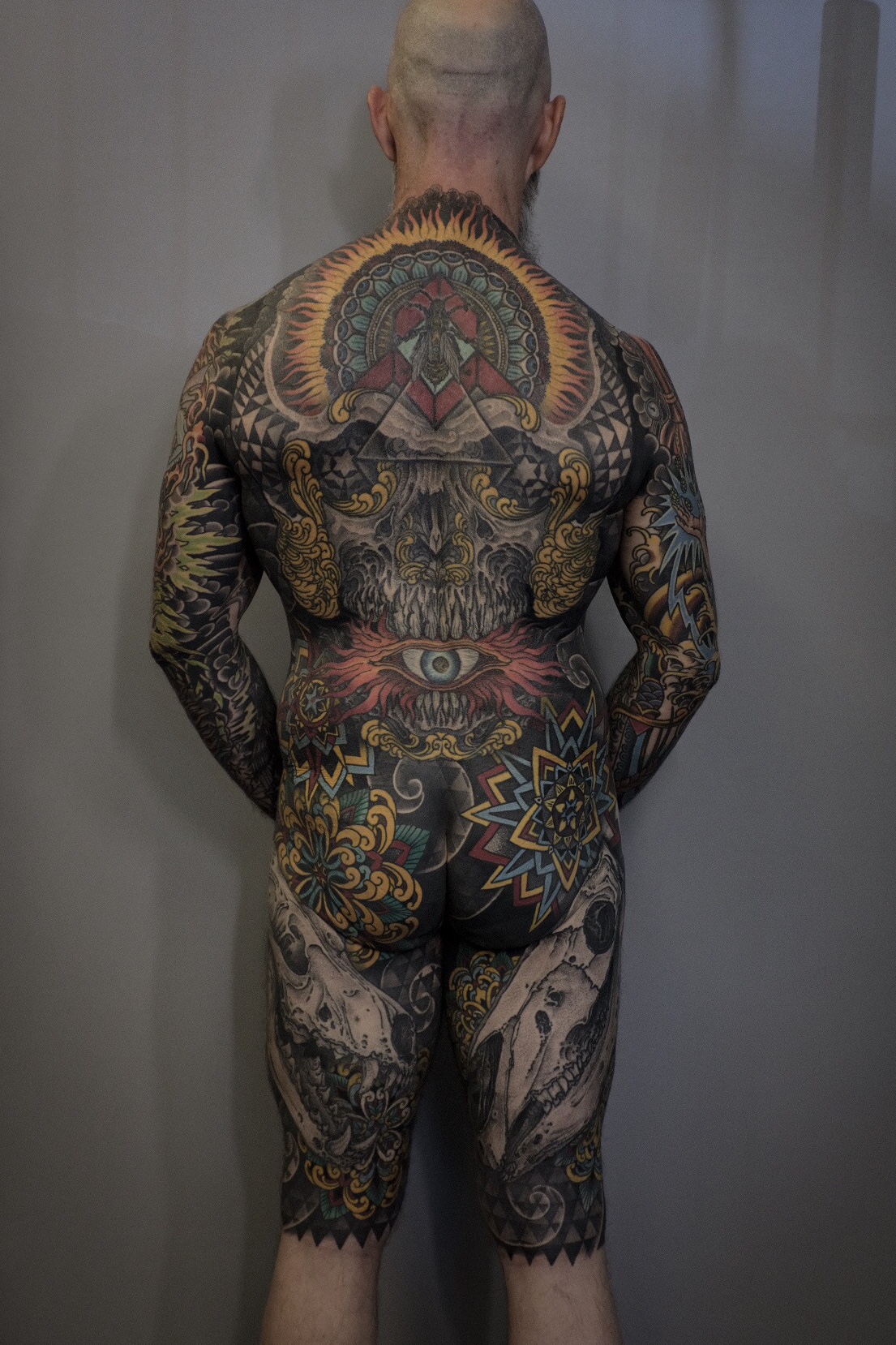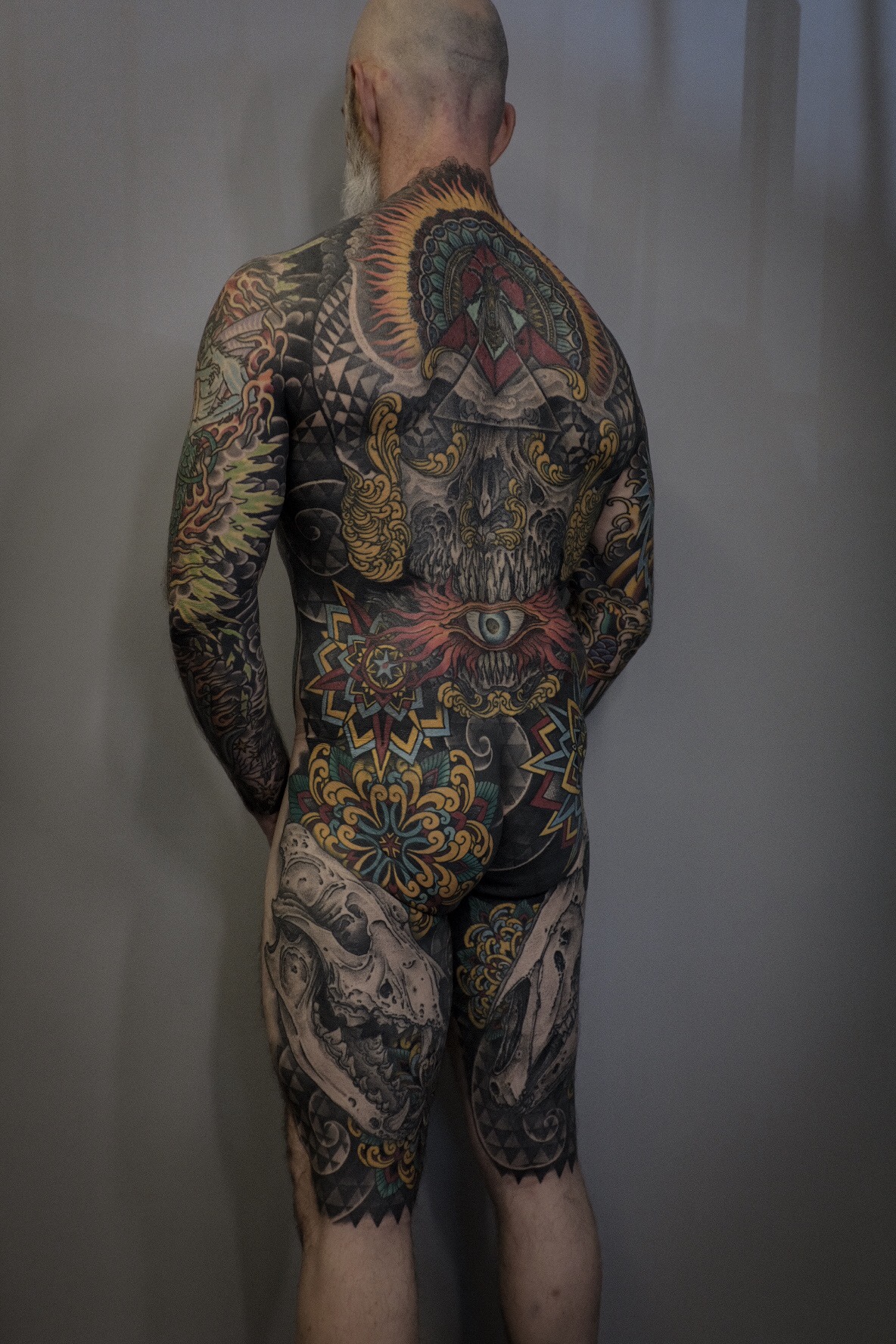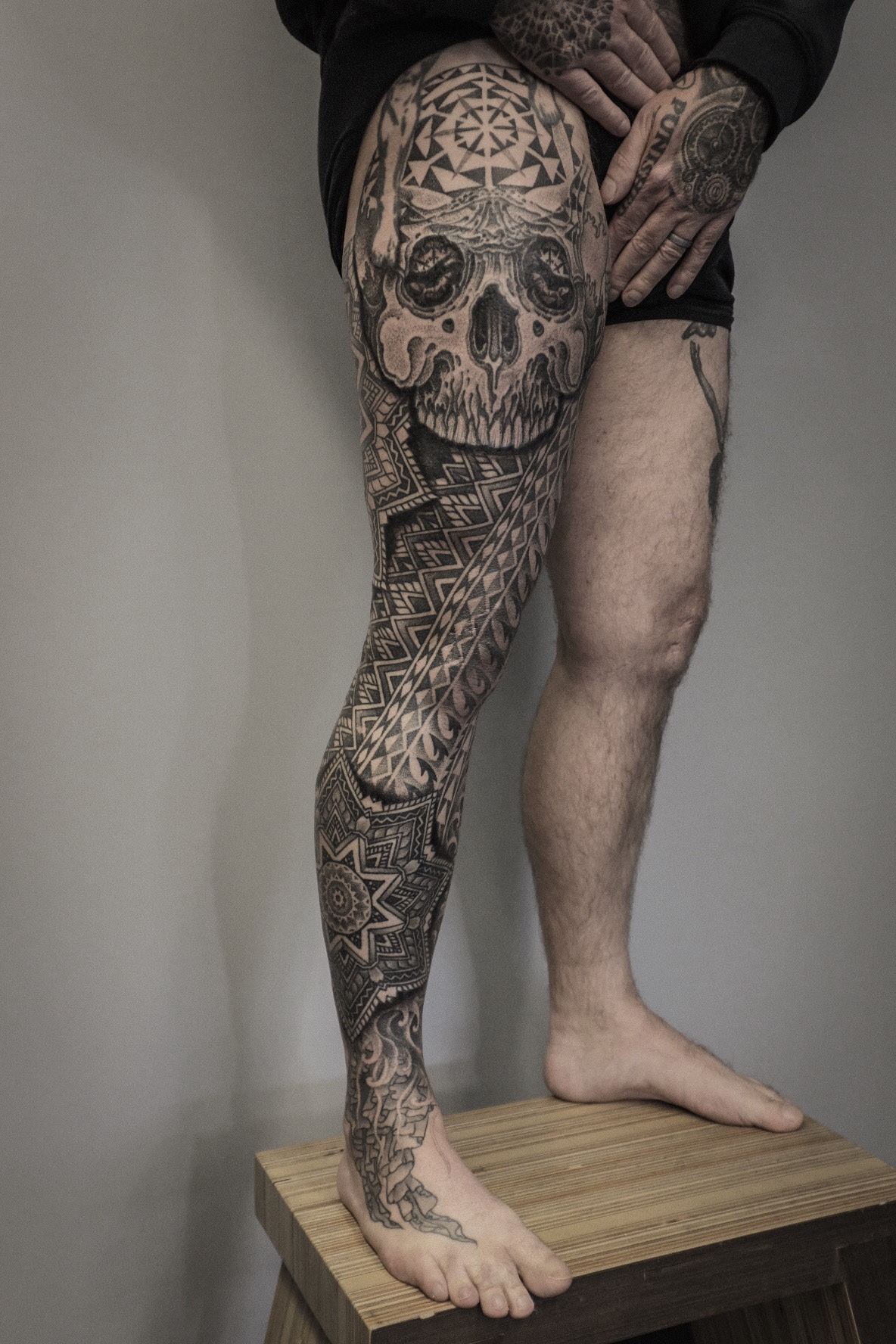 Creating art is something that I have found to be a necessary way to feel at peace and ease with myself and my surroundings, creating art and ornamental decoration for the human body is a complete privilege and a total honor. It is something I constantly marvel at, it feels magical and is a totally surreal occupation for both the artist and canvas. Ted has been coming to get tattooed by me since 2012, we started at Saved tattoo in Brooklyn and continued in Austin Texas, at Rock of Ages, he is one of only a few customers who only get tattooed by me, a stoic and kind man who has constantly followed through, completing each stage of his body suit with a keen integrity. His level of commitment traveling from Port Perry in Canada to get tattooed is nothing short of incredible. As we round the corner to the final stages with only one session left on his legs and his sleeves to start and complete, I wanted to take a moment to thank him and share some images of our last two sessions that we just finished up this week whilst I was guesting at Saved Tattoo.