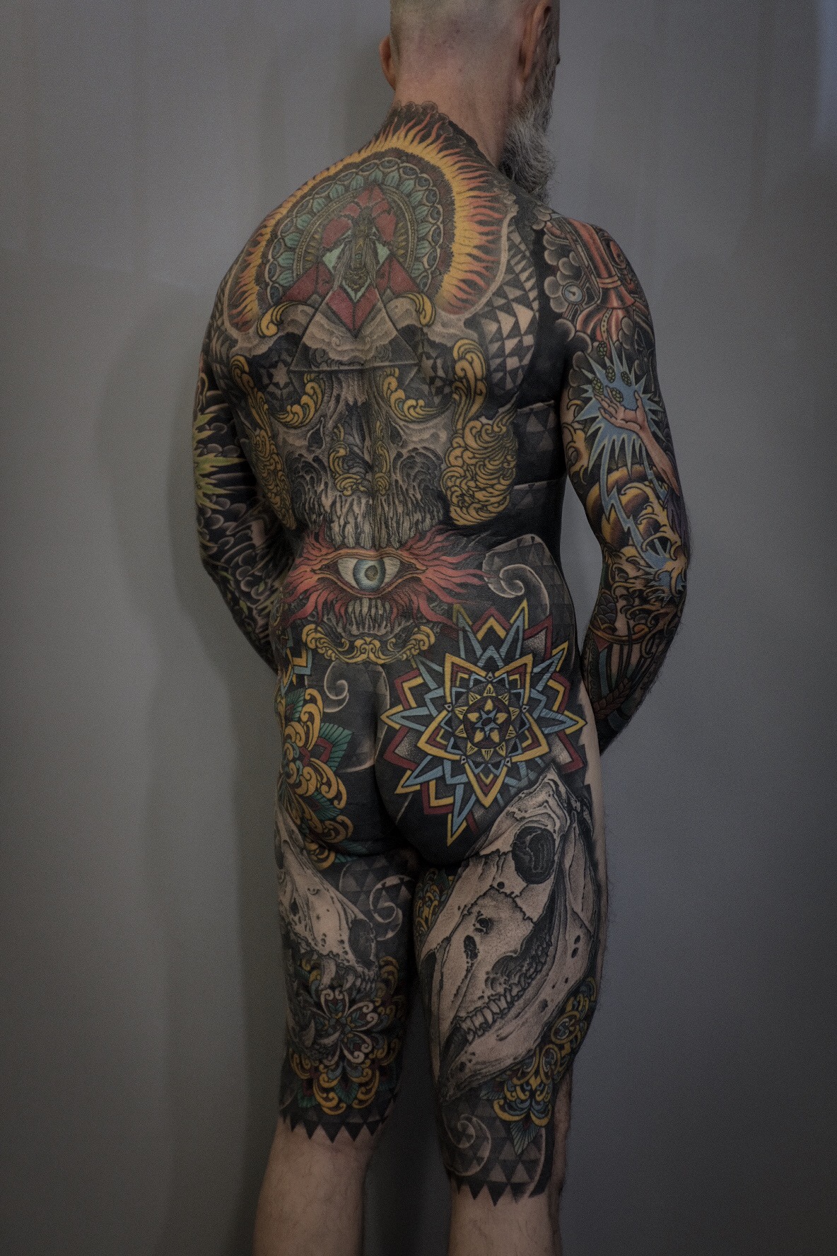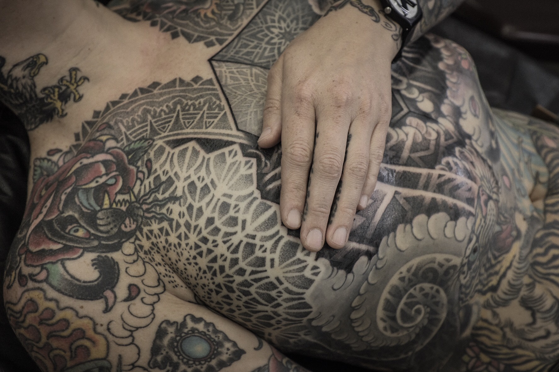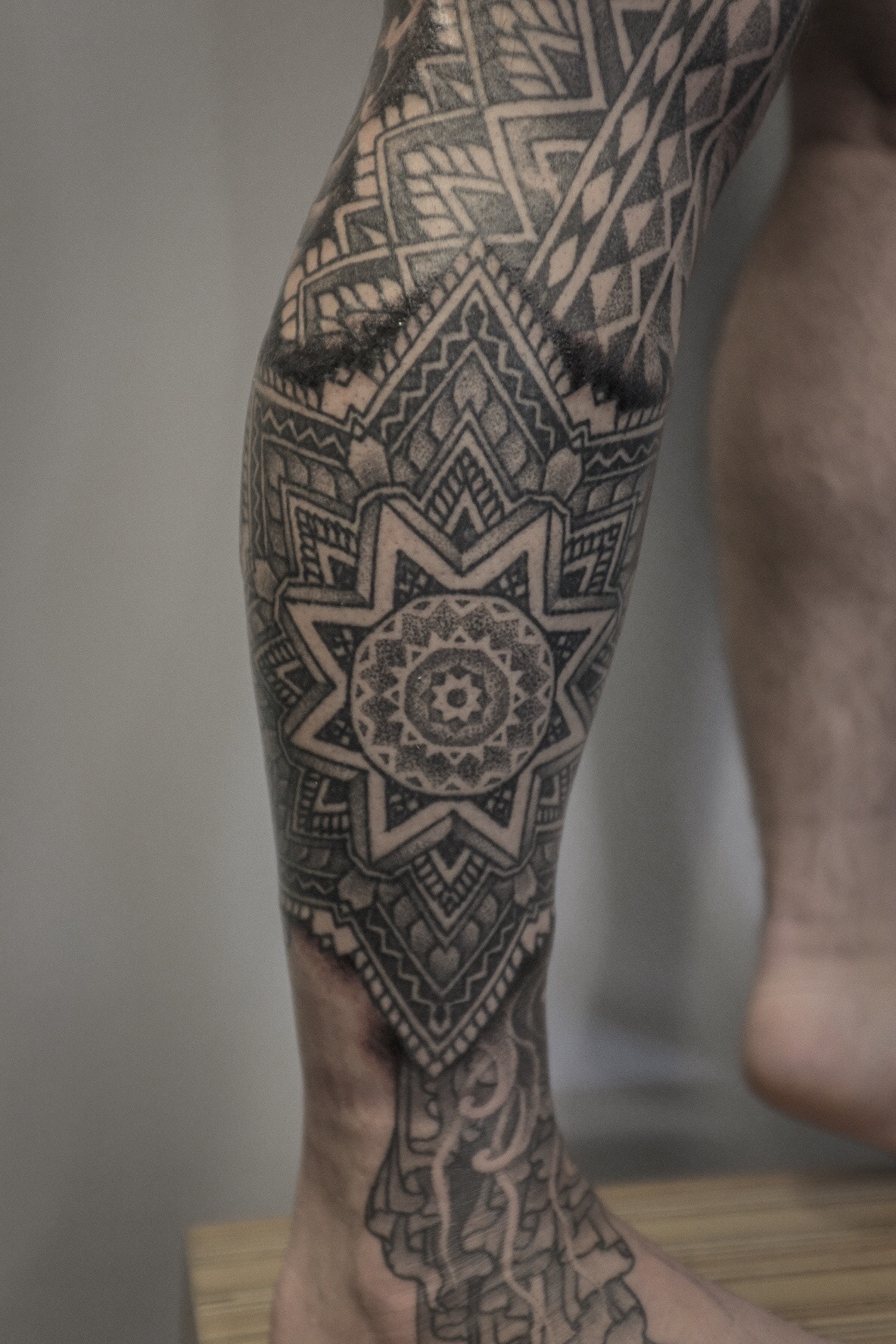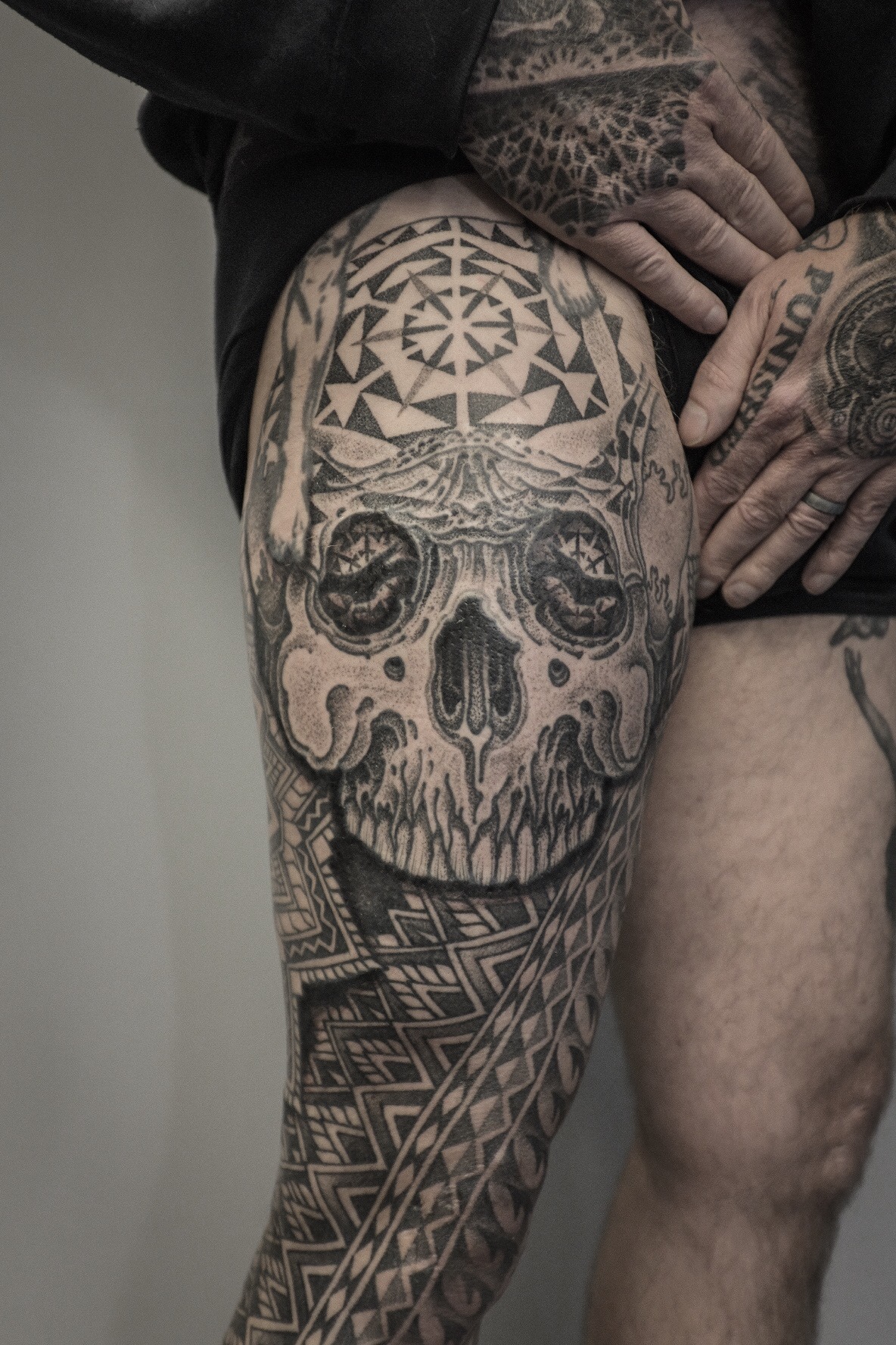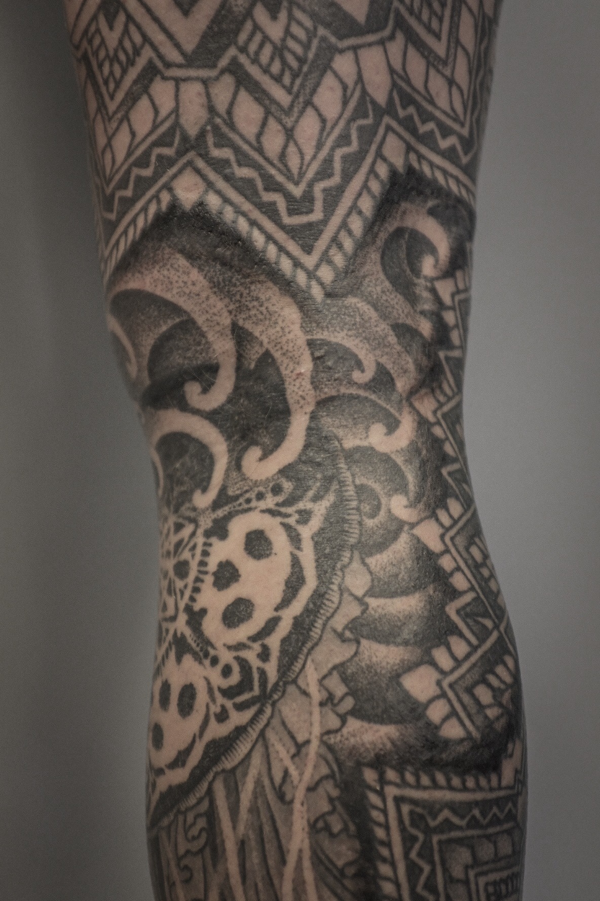 Creating art is something that I have found to be a necessary way to feel at peace and ease with myself and my surroundings, creating art and ornamental decoration for the human body is a complete privilege and a total honor. It is something I constantly marvel at, it feels magical and is a totally surreal occupation for both the artist and canvas. Ted has been coming to get tattooed by me since 2012, we started at Saved tattoo in Brooklyn and continued in Austin Texas, at Rock of Ages, he is one of only a few customers who only get tattooed by me, a stoic and kind man who has constantly followed through, completing each stage of his body suit with a keen integrity. His level of commitment traveling from Port Perry in Canada to get tattooed is nothing short of incredible. As we round the corner to the final stages with only one session left on his legs and his sleeves to start and complete, I wanted to take a moment to thank him and share some images of our last two sessions that we just finished up this week whilst I was guesting at Saved Tattoo.