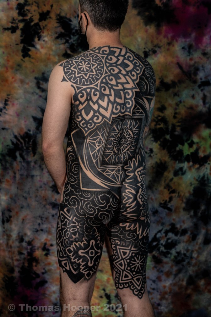Today my work draws its influences from many things, the sanctum of nature and natural forms, the unconscious, mathematical and geometric patterns, cosmology, and eastern religious images. I try to incorporate these ideas into intricate patterns and symbolism using complex pointillism, repetition, and detailed line-work with the hopes of creating a visual language that is both meditative and pure in form. It is my belief that a tattooist should always be striving to improve his or her skill and to be conscious of how their tattoos may relate and ultimately contribute to the surrounding world of tattooing. I am constantly exploring new ways to improve the skills and options available to me, finding new ways to develop techniques and tools beyond what is already necessary. Given that the skin is my primary material, the path forward for my craft to expand and improve is to find new ways to illustrate and decorate the people I am fortunate enough to tattoo.